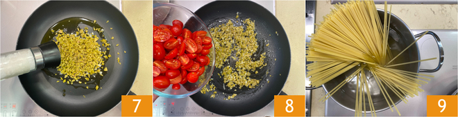Agrega sal y deja dorar por un minuto 7. Añade los tomates cherry y rehógalos por un par de minutos 8. Mientras tanto, hierve las linguine por la mitad de su tiempo de cocción.