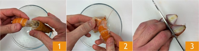 Para preparar las linguine con cigalas, burrata y espárragos, lo primero que debes hacer es limpiar las cigalas. Separa la cabeza de los crustáceos 1, con un palillo elimina el intestino y extrae la carne del caparazón 2. Reserva por separado tanto la carne como las cabezas y los caparazones en dos tazones distintos. Corta la chalota en 4 partes 3.