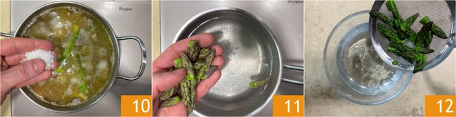 Regula de sal y pimienta blanca 10 y deja cocer durante 30 minutos. Mientras tanto, corta las puntas de los espárragos y blanquéalas en agua ligeramente salada durante 3 minutos 11. Escúrrelas y enfríalas en agua con hielo 12 para detener la cocción y mantener el color.