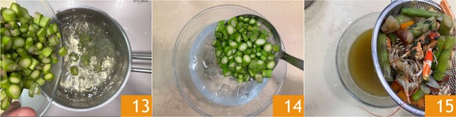 Corta los tallos en rodajas y blanquéalos en la misma agua durante 3 minutos 13. Escúrrelos y enfríalos en agua con hielo 14. Filtra también el fondo de cigalas 15, vuelve a ponerlo al fuego y haz que reduzca su volumen a la mitad a fuego medio-bajo durante unos 20-30 minutos.