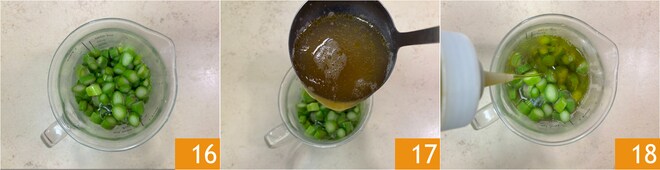 Pon los tallos de los espárragos en un vaso 16, añade un cucharón de fondo de cigalas 17 y un chorrito de aceite 18.