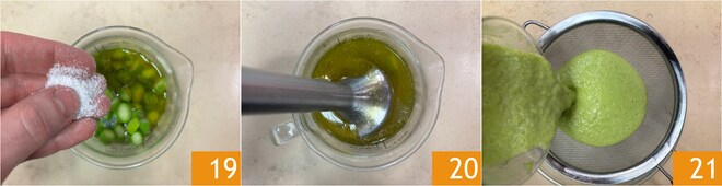 Regula de sal y pimienta blanca 19 y tritura, con la batidora de mano 20, hasta obtener una crema homogénea, pásala por un colador fino 21 y reserva.