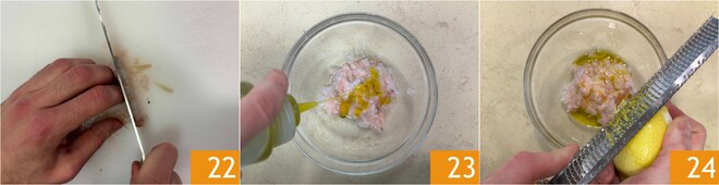 Corta finamente la carne de cigalas 22, ponla en un tazón y añade un chorrito de aceite 23 y la piel de limón rallada 24.