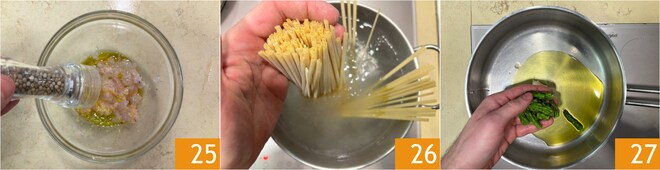 Ajusta de sal y pimienta blanca 25. Mezcla bien y deja marinar hasta el momento de usar. Cocina las linguine en agua hirviendo con sal 26. Mientras tanto, saltea las puntas de los espárragos en una sartén con aceite y ajo 27.