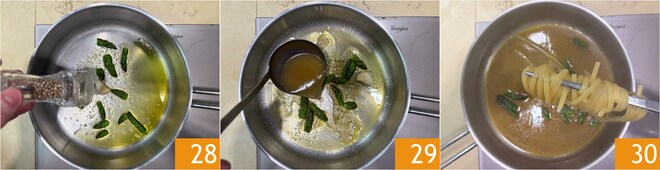 Regula de sal y pimienta blanca 28. Añade el fondo de cigalas 29 y deja que se impregne el sabor. Cuando falten 2 minutos para que la pasta esté lista, quita el ajo y escurre la pasta. Transfiérela a la sartén 30 y termina la cocción.