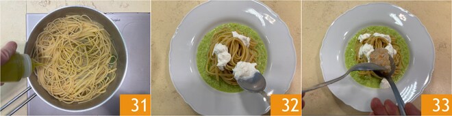 Apaga el fuego y mezcla con aceite 31. En el fondo del plato coloca la crema de espárragos, sobre ella coloca la pasta, añade trozos de burrata 32 y el tartar de cigalas 33.