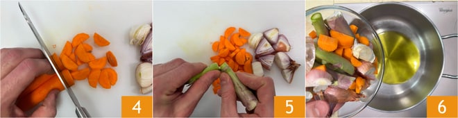 Pela las zanahorias y luego córtalas por la mitad y luego en rodajas 4. De los espárragos recupera la parte más leñosa del tallo rompiéndola con las manos 5 y reserva la parte más tierna. Para preparar el fondo de cigalas, en una cacerola añade el aceite, añade la chalota, las zanahorias, el ajo aplastado con la piel y los tallos de los espárragos 6, mezcla y deja sofreír durante unos minutos.