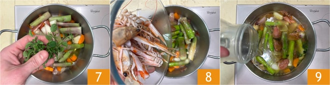 Añade la mejorana 7 y los restos de las cigalas 8, mezcla y deja tostar durante unos minutos. Cubre con agua fría 9.