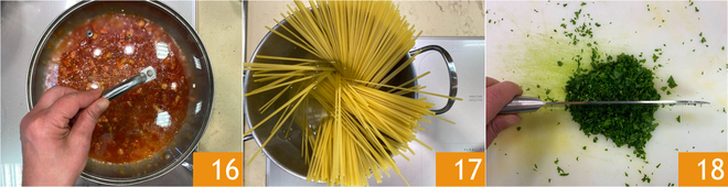 Coloca una tapa sobre la sartén 16 y deja cocinar a fuego lento durante 20-30 minutos, si es necesario añade un poco de agua. Cuando la salsa esté casi lista, cuece las linguine en abundante agua hirviendo con sal 17 y pica finamente el perejil 18.