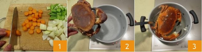 Para preparar las linguine picantes con cangrejo, lava las verduras bajo abundante agua fría corriente y corta la zanahoria, el apio y la cebolla en trozos bastante gruesos, reservando aparte 1. Pon a fuego una cacerola con agua ligeramente salada y hierve el cangrejo durante 5 minutos 2. Cuando esté listo, escúrrelo con una espumadera y déjalo templar 3.