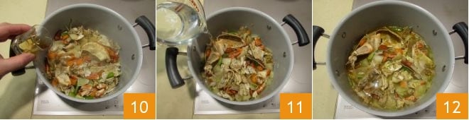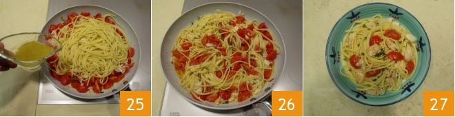 enciende el fuego, añade el caldo de pescado que has preparado 25, distribuyéndolo de manera homogénea 26. Saltea unos instantes para dar sabor, finalmente sirve tus linguine picantes con cangrejo bien calientes, decorándolas con unas hojitas de tomillo 27.