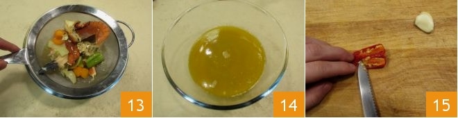 Una vez listo, cuela todo con la ayuda de un colador de malla fina 13 y reserva aparte 14. Corta por la mitad el chile y elimina las semillas internas 15.