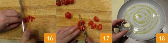 Pícalo finamente 16 luego lava los tomatitos y divídelos en 4 partes 17. Sofríe un diente de ajo en una sartén antiadherente con un chorrito de aceite de oliva virgen extra 18;