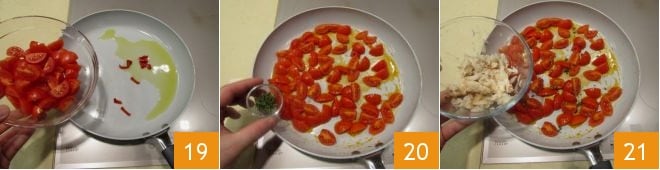 retira el ajo y añade el chile y los tomatitos 19, sazona con sal y pimienta y añade el tomillo, cocinando durante 10 minutos 20. Vierte en la sartén la carne de cangrejo 21