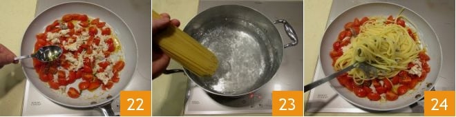 junto con el caldo que has preparado anteriormente 22, mezcla con una espátula y apaga. Pon a fuego una cacerola con agua, cuando haya alcanzado el hervor, cocina los espaguetis durante 8 minutos, dejándolos al dente 23. Una vez listos, escurre la pasta y viértela directamente en la sartén con el condimento 24;