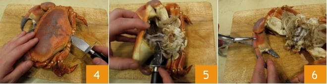 Procede entonces a limpiar el cangrejo: con un cuchillo pequeño quita el ala caudal 4 y divide la parte superior de la inferior. Elimina el saco del estómago, las branquias suaves, ya que no son comestibles, 5 y extrae la carne tierna y cremosa. Abre las pinzas con unas tenazas 6 y retira la carne en trozos grandes.