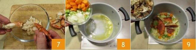 Gira las patas una a una con un movimiento decidido en dirección opuesta a la que están orientadas para separarlas y extrae la carne escondida en el interior 7. Reserva los restos porque te serán útiles. En una sartén, derrite la mantequilla y añade el aceite 8. Agrega las verduras cortadas groseramente y sofríelas durante 5 minutos. Añade los restos del cangrejo 9,