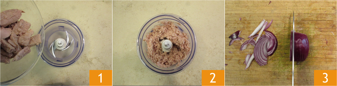 Para preparar las linguini a la crema de atún, pon el atún escurrido en la batidora 1 y tritúralo hasta que quede fino 2. Limpia y corta la cebolla roja 2.