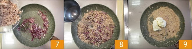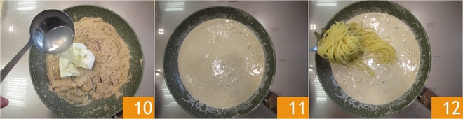 Sazona las cebollas pochadas, añade el atún triturado 8 y mezcla todo. Cocina un par de minutos. Vierte un cucharón de agua de cocción de la pasta 8 y el queso cremoso 9.