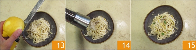 Sirve las linguini a la crema de atún bien calientes sazonando los platos con ralladura de limón 13, pimienta negra 14 y orégano fresco 15.