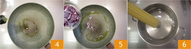 Calienta un chorro de aceite de oliva virgen extra en una sartén grande 4, añade la cebolla 5 y sofríe a fuego lento. Cocina las linguini en abundante agua salada 6.