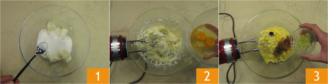 Para preparar la Linzer torte, en un bol grande verted la mantequilla blanda, el azúcar, la sal 2 y trabajadlo todo con las varillas eléctricas durante un par de minutos. Añadid los huevos a temperatura ambiente 2 y seguid trabajando hasta que se absorban por completo. Añadid al compuesto las especias, la pulpa de la vaina de vainilla y la piel de limón rallada 3.