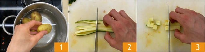 Para preparar la lubina gratinada con tomates, patatas y calabacines, como primer paso pon a cocer las patatas 1 durante unos 40 minutos. Mientras tanto, de los calabacines separa la parte exterior del corazón, corta la primera en tiras 2 y la segunda en cubitos 3.