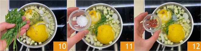 Continúa con el perejil 10, la sal gruesa 11 y la pimienta rosa 12. Lleva a ebullición y cocina durante unos 30 minutos.
