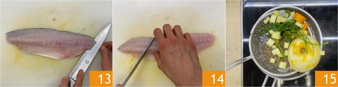 Mientras tanto, quita la piel de los filetes de lubina 13 y corta cada filete en 3 losanges 14. Una vez transcurrido el tiempo, retira las verduras del caldo 15.