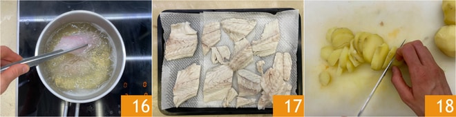Cuece la lubina en el caldo durante unos 2 minutos 16. Escúrrela y déjala reposar sobre papel absorbente 17. Quita la cáscara de las patatas, córtalas en rodajas 18 y reserva.