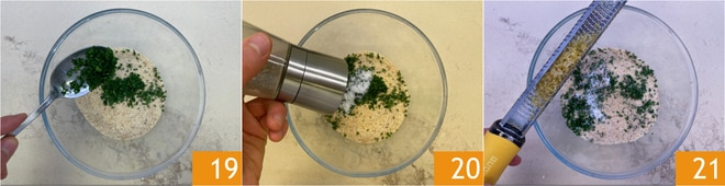 Para la panure, pon en un cuenco el pan rallado y añade el perejil picado 19, la sal, la pimienta 20, la ralladura de limón 21 y mezcla.