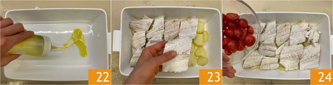 En una fuente para horno de 30x20 cm vierte un poco de aceite 22 y coloca en el fondo las patatas. Coloca la lubina sobre la cama de patatas 23 y cúbrela con los tomatitos cortados a la mitad 24.