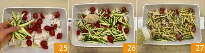 Continúa con las tiras de calabacín 25 y cubre todo con la panure 26. Completa con un chorrito de aceite 27.