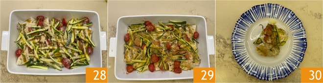 Una vez completada la estratificación 28, cocina en horno estático a 180°C durante unos 15 minutos 29. Tu lubina gratinada con tomates, patatas y calabacines está lista para ser servida caliente 30.