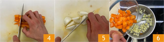 Corta las zanahorias en cubitos 4, la cebolla en gajos 5. En este punto prepara el court bouillon, es decir, el caldo aromático. En una olla vierte el agua y añade el corazón de los calabacines y las zanahorias 6.