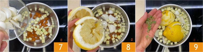Incorpora la cebolla 7, el zumo de limón, el limón exprimido 8 y el tomillo 9.