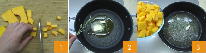 Para preparar los lumaconi con calabaza y caciocavallo, primero pon a calentar una olla de agua para cocinar la pasta que debe ser salada al hervir, luego limpia la calabaza y córtala en cubitos 1: en total deberás obtener aproximadamente 530 g de pulpa. En una cacerola, derrite la mantequilla con el aceite junto con el diente de ajo y las ramitas de romero 2, luego agrega la calabaza 3.