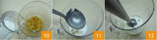 Mientras tanto, toma parte de la calabaza de la sartén y transfiérela a un recipiente alto y estrecho, añade la nata 10 y un cucharón del agua de cocción de la pasta 11 y mezcla con una batidora de mano para obtener una crema homogénea 12.