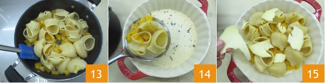 Pasado el tiempo de cocción, escurre los lumaconi y agrégalos a la calabaza restante en la sartén, mezclando bien 13. Ahora transfiere la mitad de los lumaconi así condimentados a la bandeja 14 y distribuye encima la mitad del caciocavallo en rodajas 15.
