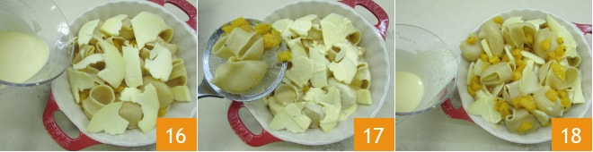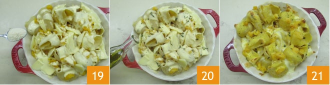 Vierte también la mitad de la crema de calabaza 16 y repite las capas añadiendo los conchiglioni restantes 17, el resto del caciocavallo y la crema restante 18.
