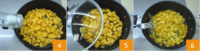 Sazona con sal 4, pimienta, cubre con la tapa 5 y cocina a fuego medio durante unos 10 minutos. Cuando la calabaza esté cocida, retira el ajo y el romero de la sartén 6 y reserva.