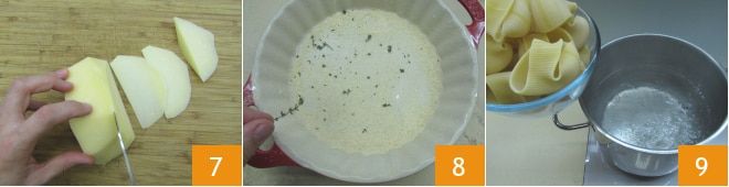 Corta el caciocavallo en rodajas finas 7. Engrasa una bandeja y espolvoréala con pan rallado y las hojitas de tomillo fresco 8. En este punto, el agua debería haber llegado a ebullición, así que agrega los lumaconi 9 y cocínalos por la mitad del tiempo de cocción indicado.