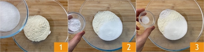 Para preparar las madeleine, lo primero que tienes que hacer es derretir la mantequilla y dejarla templar. En un bol, pon la harina y el azúcar 1, la levadura 2 y la sal 3.