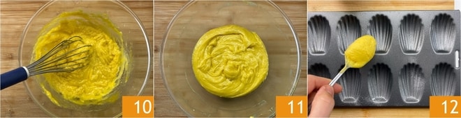 Cuando hayas conseguido una consistencia homogénea 10, deja reposar la masa en el frigorífico durante al menos una hora 11, cubierta con film transparente. Pasado este tiempo, unta con mantequilla un molde para madeleine y llena cada cavidad con medio cucharón de masa 12, ayudándote con otro cucharón para hacerla deslizar.