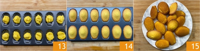 No llenes demasiado las cavidades, de lo contrario, la masa se desbordará durante la cocción 13. Hornea en un horno estático precalentado a 200°C durante unos 13 minutos. Una vez doradas, sácalas del horno 14 y da la vuelta al molde para desmoldar las madeleine. Déjalas templar y sirve 15!