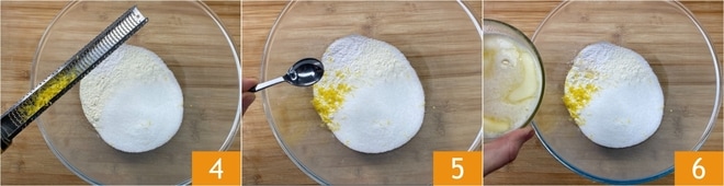 Sazona con la ralladura de limón 4 y el aroma de almendras amargas 5, luego añade la mantequilla derretida ya templada 6.