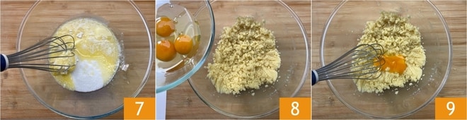 Mezcla enérgicamente con una varilla para amalgamar el compuesto 7. En este punto, añade un huevo a la vez 8, mezclando cada vez con la varilla para que se absorba completamente 9.