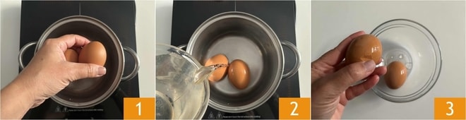 Para preparar la mayonesa con huevos duros, empieza cociendo los huevos. Coloca los huevos en un cazo 1 y cúbrelos con abundante agua, pon el cazo al fuego, lleva a ebullición y cocina los huevos durante 9 minutos, contando el tiempo desde que comienza a hervir 2. Una vez transcurrido el tiempo de cocción, deja enfriar los huevos a temperatura ambiente o, para acelerar el proceso, bajo agua corriente. Golpea ligeramente los huevos para romper la cáscara 3.