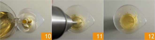 Vierte el aceite de semillas 10, luego bate todo con la batidora de mano 11 hasta obtener una mezcla esponjosa, suave y homogénea 12.