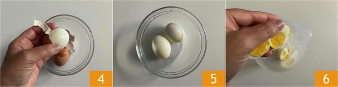 En este punto, retira con cuidado la cáscara 4 de ambos huevos 5 y córtalos en dos partes 6.